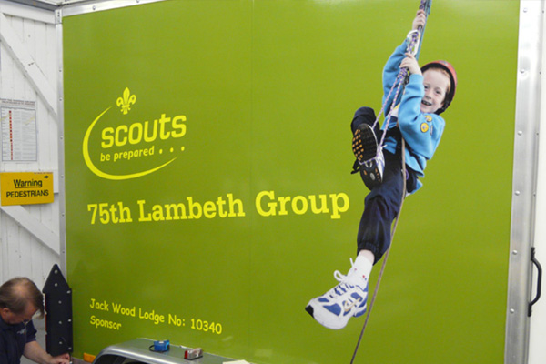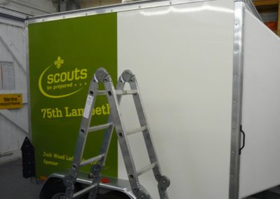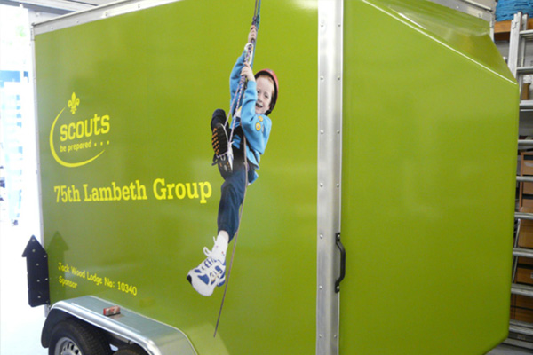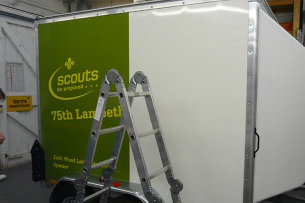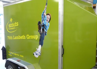 Every now and again we receive an unusual ‘vehicle’ graphic project – such as this complete vinyl coverage to a trailer for the 75th Lambeth Group Scouts.